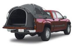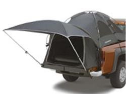 Set-up camp anywhere your truck will take you. Roomy tent includeds a floor and extends over the tailgate to sleep 2. Access sleeve lets you run wires from inside the cab to inside the tent. 4 no-see-um mesh windows for, includes awning, rainfly, and carrying bag. Adjustable awning poles and shock corded fiberglass poles. Tent extends to the end of the tailgate. Size: Full Size Long Bed (8'). Includes an awning. Comes in charcoal. GM logo.